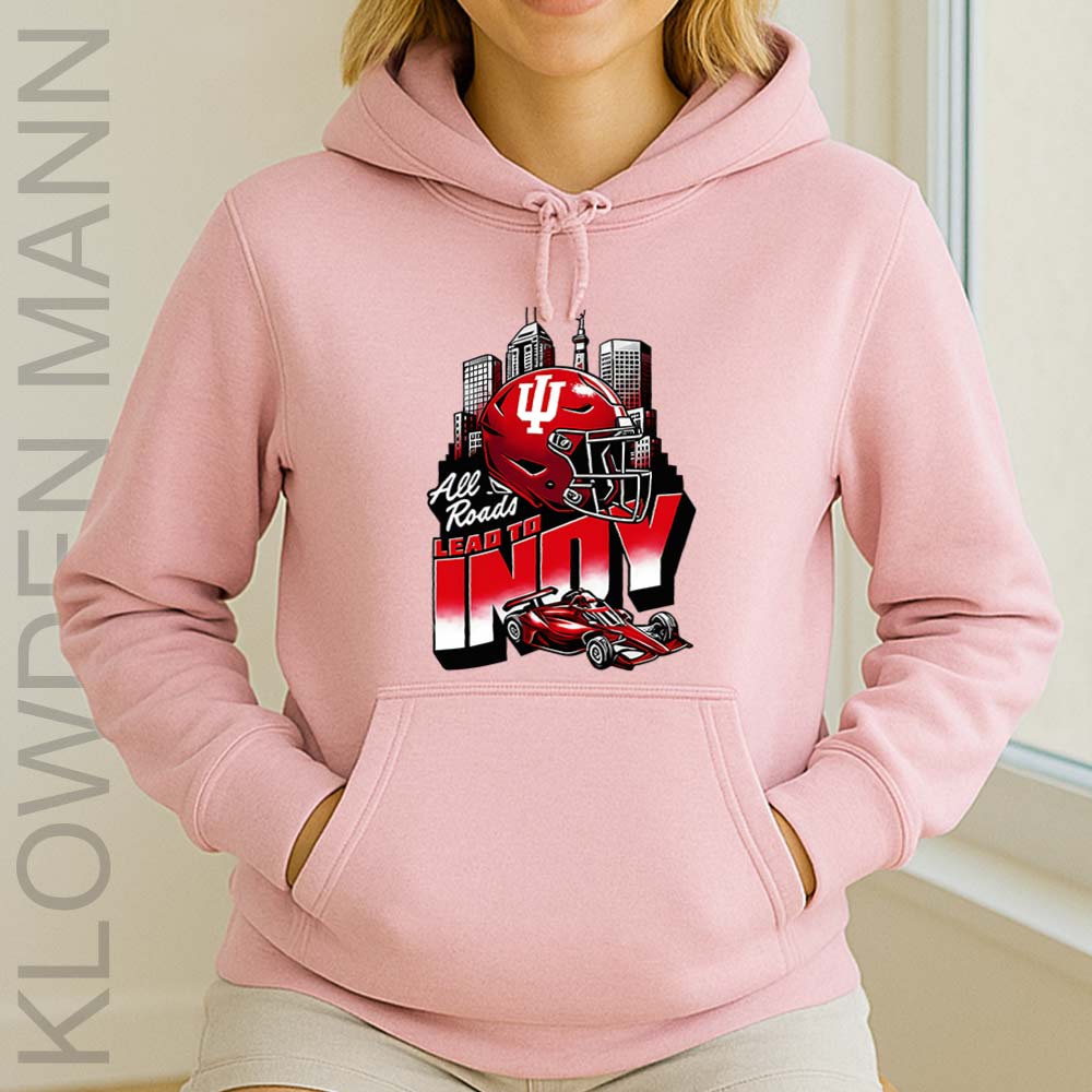 This All Roads Lead to Indy Shirt captures the electric energy that builds all season long, as every snap, every drive, and every victory pushes the team closer to Indianapolis. Front and center, the bold IU helmet rises above the city skyline, symbolizing the Hoosiers’ determination to carve their path toward championship glory. Beneath it, an Indy-style race car speeds forward—a nod to Indiana’s racing heritage and the fast, relentless momentum of Hoosier football.