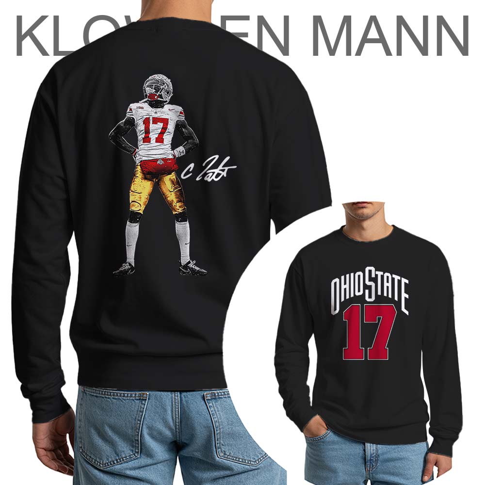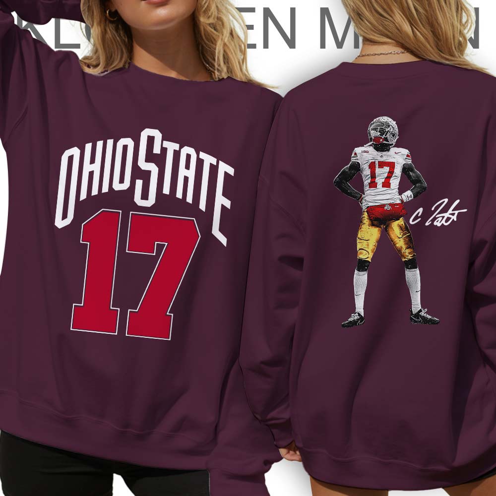 This Carnell Tate Shirt puts Ohio State wide receiver Carnell Tate front and center, celebrating one of the Buckeyes’ rising stars with a design as bold as his play on the field. On the front, the clean “Ohio State 17” layout nods to his jersey number—simple, proud, and instantly recognizable to anyone who follows the Scarlet and Gray. Flip it over, and the shirt becomes a full tribute: a striking illustration of Tate standing tall in his uniform, hands on his hips, radiating the calm, confident swagger that has Buckeye fans excited for what’s ahead.