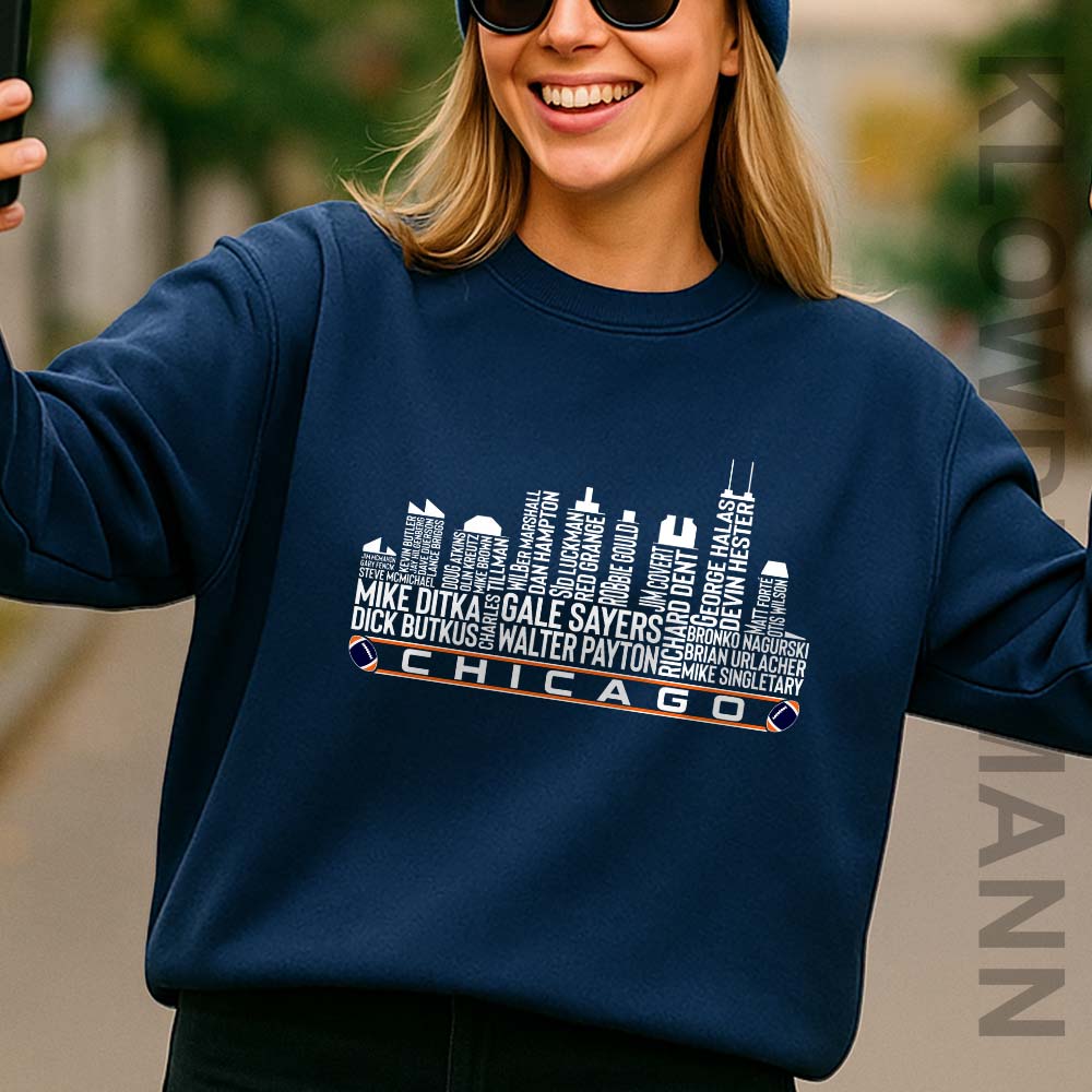 This Greatest Of All Time Legends shirt puts Chicago greatness front and center, transforming the city skyline into a powerful tribute to its all-time legends. Each name is carefully arranged to form the skyline itself, blending bold typography with iconic architecture to honor the players and figures who shaped Chicago sports history.