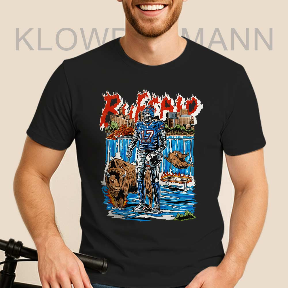 Standing at the center of this Josh Allen Buffalo Bills Skeleton Hoodie is a bold, gritty reimagining of Josh Allen—part warrior, part legend—rendered in a striking skeleton style that immediately commands attention. Flames rise over a stylized Buffalo skyline as charging bison surround the figure, symbolizing raw power, resilience, and the unbreakable spirit of Bills Mafia.
