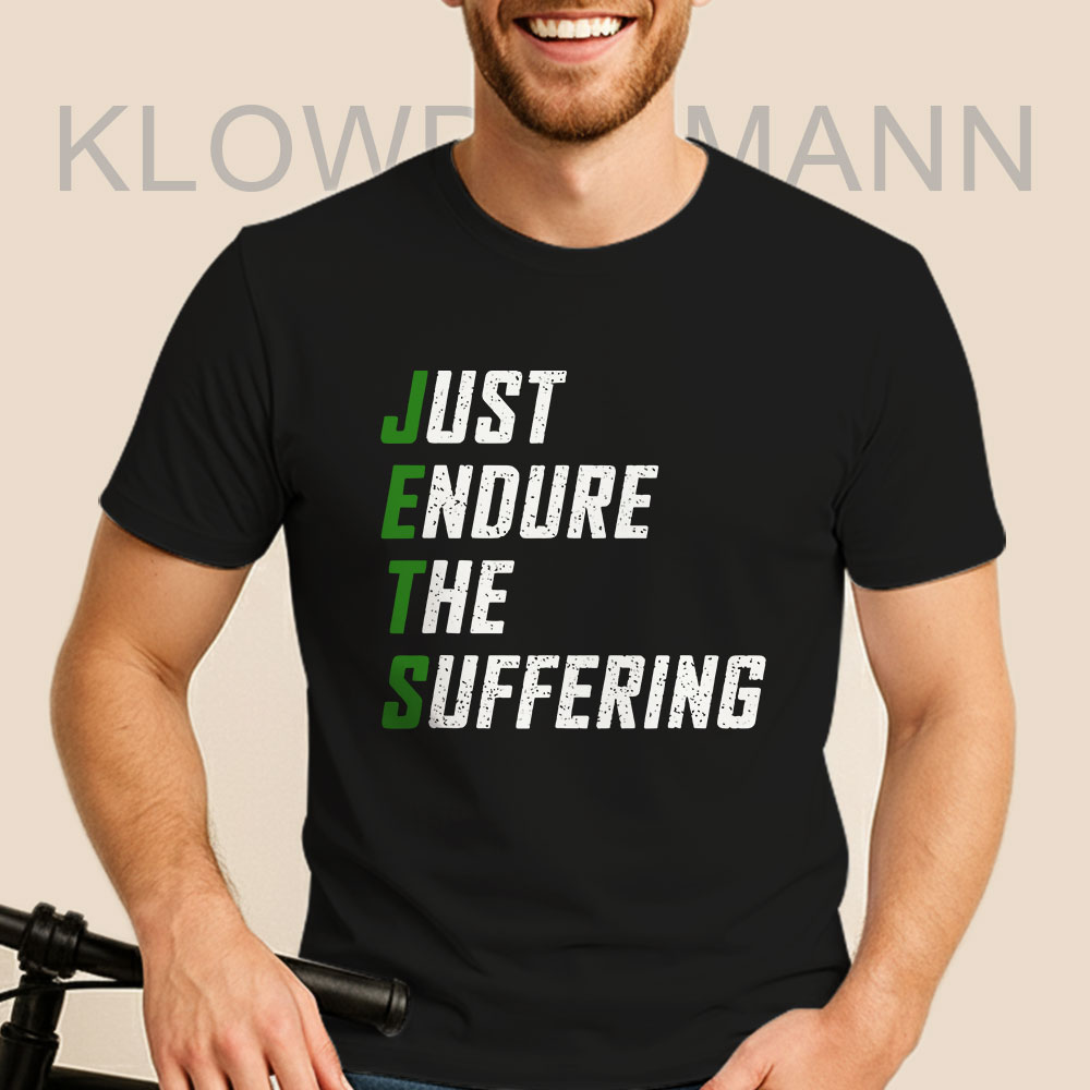 This Just Endure The Suffering shirt says everything New York Jets fans feel without needing to explain a thing. “Just Endure The Suffering” is stacked front and center in a bold, distressed font, with J-E-T-S highlighted vertically in green against a black background—simple, sharp, and painfully honest.
