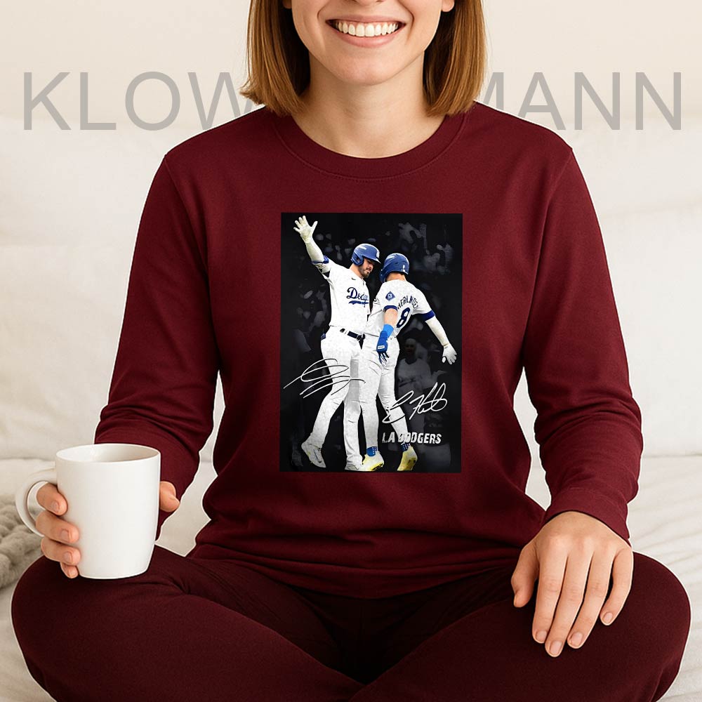 Each player’s autograph appears elegantly below the image in clean white script, balancing the composition and adding an authentic, collectible feel. The LA Dodgers text beneath ties everything together with a polished finish. Printed on a classic black shirt, the design’s contrast highlights every detail — from the players’ expressive motion to the iconic blue accents on their uniforms.