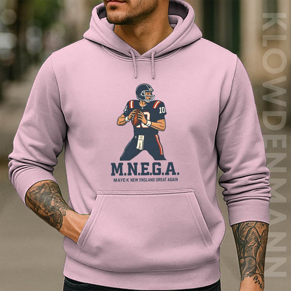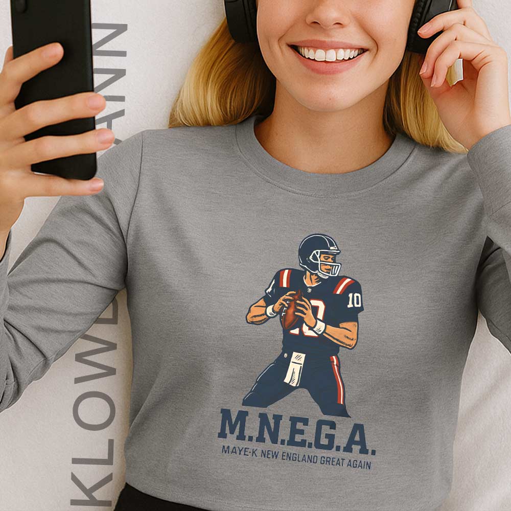 This Maye K New England Great Again shirt celebrates renewed hope for the future of the New England Patriots with a bold quarterback illustration and the slogan “M.N.E.G.A – Maye K New England Great Again.” The clean, centered graphic features Drake Maye in action, paired with strong, block-style lettering that echoes classic football poster design.