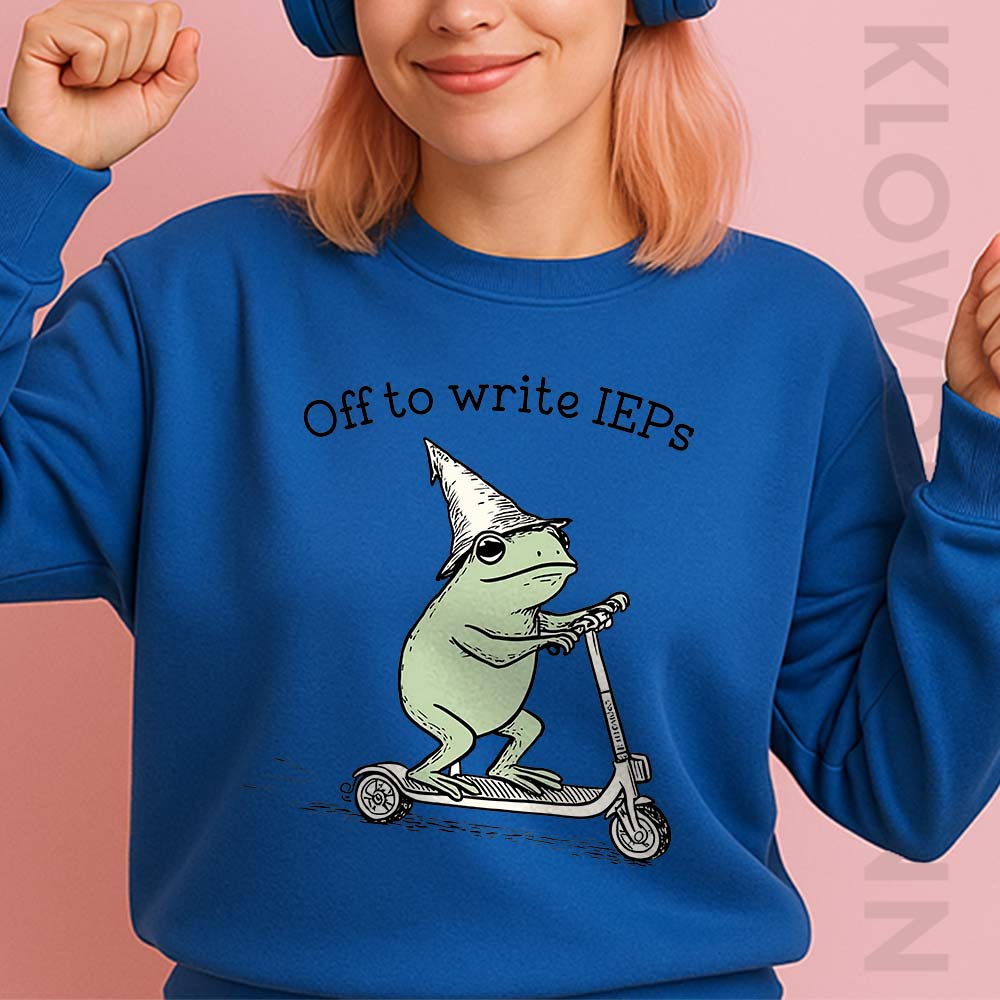 The playful illustration sits at the center of the shirt, paired with the phrase “Off to write IEPs” in a friendly curved font. It’s a lighthearted treat for school psychologists, special education teachers, and anyone who knows the unique mix of patience, humor, and dedication behind every student plan. The Off to Write IEPs Shirt turns a demanding task into a moment of whimsy — one small, scooting frog at a time.