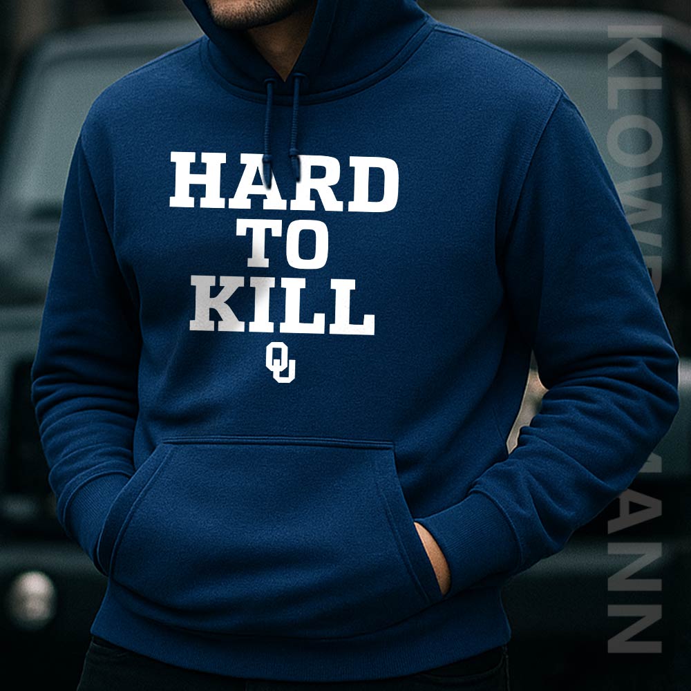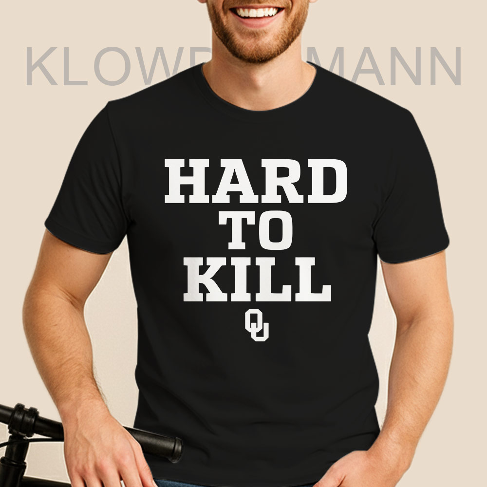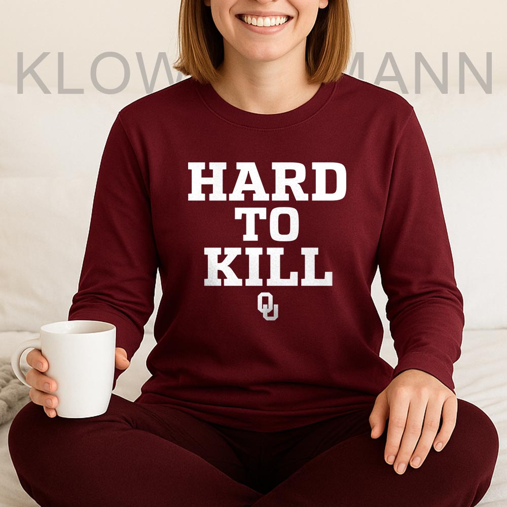 The Oklahoma Sooners Hard To Kill Shirt captures the grit and fire that define Sooner football. Bold white lettering stretches across the front—“HARD TO KILL”—stacked and centered like a direct challenge to anyone who doubts Oklahoma’s toughness. Just beneath it, the classic OU logo sits like a badge of honor, grounding the message in a legacy built on hard-fought wins and relentless spirit.