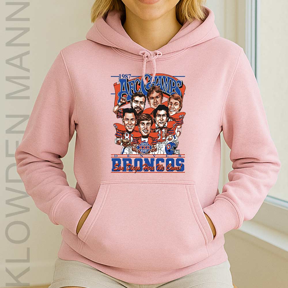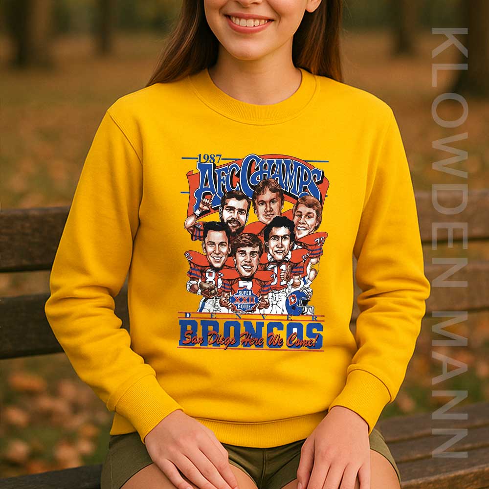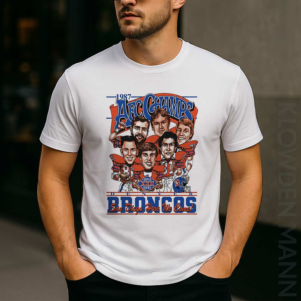 This San Diego Here We Come Shirt takes fans back to a defining moment in Denver Broncos history, celebrating the 1987 AFC Championship run with bold retro energy. The colorful illustration features a lineup of Broncos legends in a classic cartoon-style design, framed by vintage typography that proudly reads “AFC Champs” and “San Diego Here We Come.” Set against a clean white background, the artwork pops with old-school football flair and nostalgic charm.