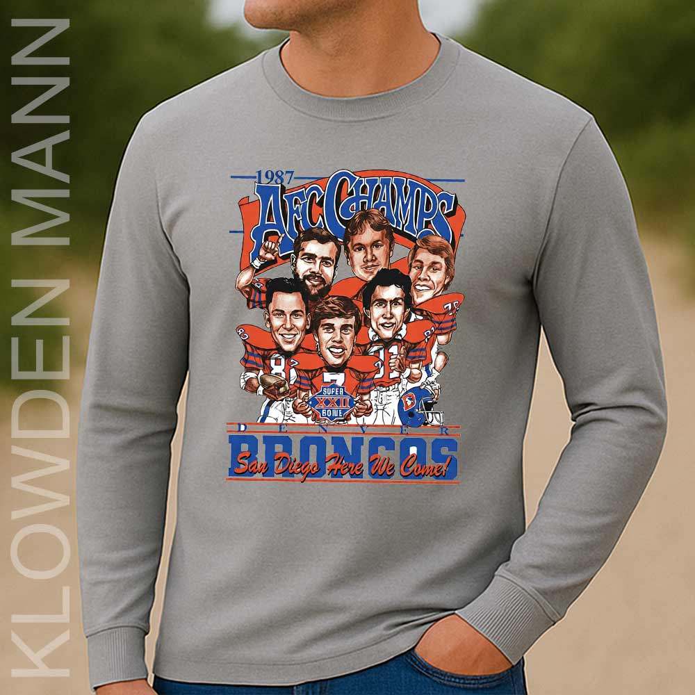 San Diego Here We Come Shirt, Denver Broncos AFC Champs 1987